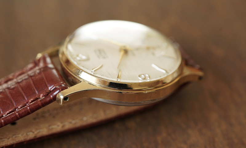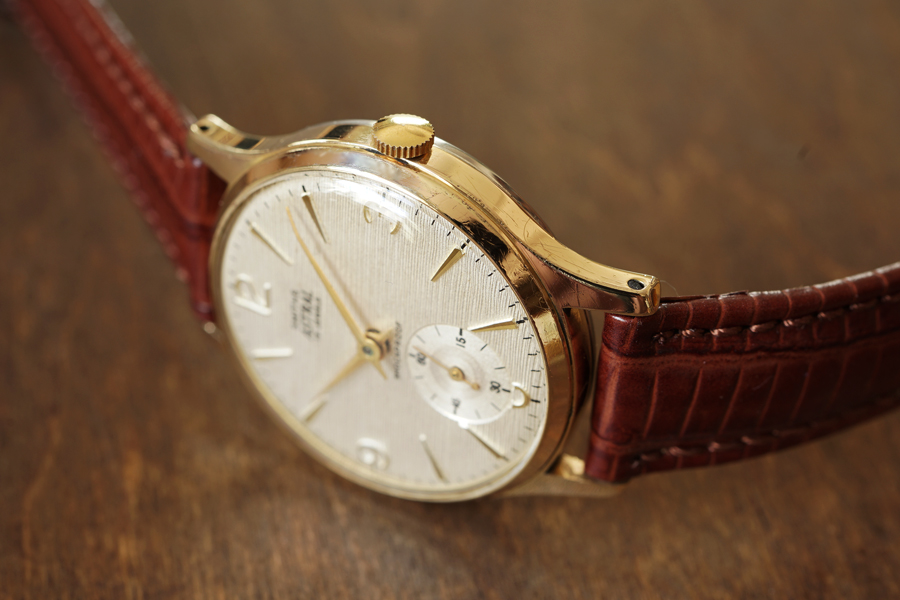 アラビア数字とバーで構成されたインデックス、そして長短針からスモセコまでゴールドで統一された、落ち着きのある文字盤デザインが魅力的。 スモセコ文字盤の地紋(同心円部分)に、極めて微細な変色が見られますが、全体的にほぼ完璧な状態を保っています。