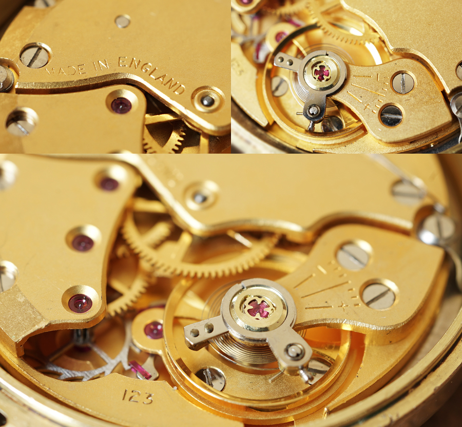 スミスの高性能ムーブメントの表面加工は、その年代により様々ではありますが、1960年代にはサテン調のギルト加工が施されマットで上質なゴール・プレーテッドの美しさが魅力です。 また、ショックプルーフ機構が振り子の軸受けに搭載されており、見た目の美しさのみならず、万一の落下などにも威力を発揮してくれる仕様です。