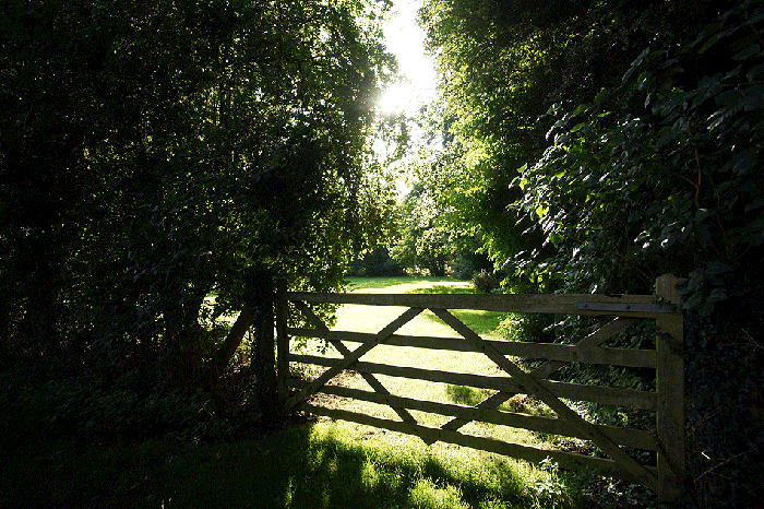 村の散歩道は牧草地に続いており