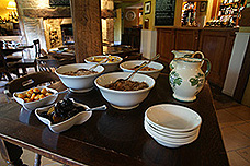 | フル・イングリッシュ・ブレックファースト シリアル(コーンフレークのこと) オレンジジュース、フルーツ、紅茶 パン、ベーコン、目玉焼き、ソーセージ 焼きトマトに巨大マッシュルーム 以上でパンはたいていお変わりできる |