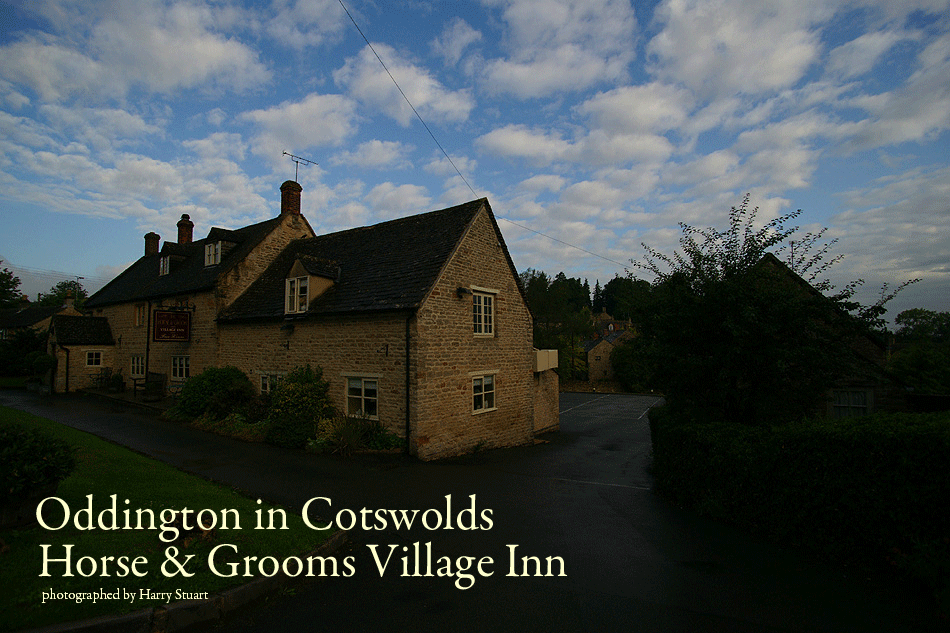 早朝Oddington の村を散歩すると 牧草地には馬が いまだに朝夕には乗馬を楽しむらしい 朝食をいただいていると、蹄の音が… さすがHorse & Grooms Village Inn |