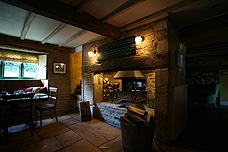 パブの内部には大きな暖炉があり 建物の煙突の位置を見るとその場所を 推察することができる 窓は小さめで採光は少ないが その分雰囲気のある演出が楽しめる 天井は、日本よりもだいぶ低い |