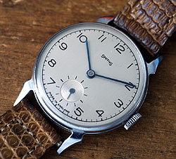 | 1940年代から1950年代の初期に生産されたスミス社製腕時計です。戦後最初期の1215シリーズのこのモデルは、ファンシーラグと呼ばれる独特の形状のラグ(ストラップを固定する部分)を持つ個性的なモデルです。ベゼル及び裏蓋はステンレス・スチール、ラグを含む本体は真鍮にクロームメッキであると思われます。コンディションはほとんど使用されていない状態ですが残念ながら裏蓋にキズがございます。ストラップはオリジナルもしくは当時の製品であると考えられます。シックではありますが、リザードスキンとの相性が抜群のとても雰囲気のあるモデルです。価格は裏蓋のキズを考慮してのスペシャルプライスです。 |