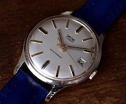 | パール調の文字盤(写真では白っぽく見えますが、実際はもう少しクリーム色です)とスクウェアな針、そして当時流行したデイ・デイトが1970年代らしいデザインです。ケースは恐らくアルミに金メッキを施しており通常のモデルよりも軽い印象があります。簡素なつくりのムーブメントですが、だいじに使用すれば意外と長持ちするものです。ケース外径33mm ケースにいくつかの線キズはありますが、深いものはなくメッキも美しい状態を保っています。また、文字盤は写真でもお分かりいただけるような汚れやしみがございます。ムーブメントのコンディションも素晴らしいので、通常の365日間保証は付きませんが、お届け時までの初期動作保証付です。