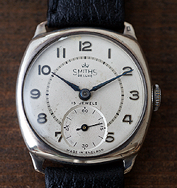 | スミスの腕時計の中では銀無垢ケースを採用したモデルは極めて少なく戦後のモデルは、すべてクッションケースと呼ばれるいわゆるクッション型のケースデザインのモデルのみが1946年から1970年まで生産されていました。このアイテムは1965年製造のデラックスでムーブメントは標準の15石にセンターの特大ルビーを1石追加してファクトリーチューニングが施してあるレア・モデルです。コンディションは全体にエイジングが見られますが、オリジナリティーは高くレンズとストラップ以外はほとんどオリジナルの状態を保っています。また、ムーブメントのコンディションは素晴らしく、安定した歩度を示しています。ケース幅29.2mm。 |