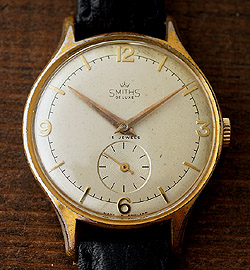 | 1950年代に生産された初期のデラックスモデルです。ケースはSSに金メッキされたと思われ、35mmと大きくスミスとしてはマグナムサイズといえます。文字盤は微妙な色合いのデュオトーン・ダイアルで、太目の針が特徴です。ストラップ幅は標準サイズの16mmで、よりサイズが大きく見えるようにデザインされています。個体数はとても少ないレア・モデルです。頻繁に使用されていた個体のようでケースのメッキは、剥がれが目立ちますが、いかにもヴィンテージの味わいが出ており、お好きな方にはお買い得な価格といえます。ムーブメントに関しては素晴らしい状態を保っており、使用した分、しっかりと整備されてきたことが、うかがい知れます。ケース(裏蓋)とムーブメントとの収まりが少々ルーズなためアルミのスペーサーが入れてあります。外径35mm。 |