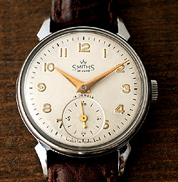 | 1950年代初期のデラックスモデルです。3ピース構造のケースは本体がクロームメッキ、そして、ベゼル及び裏蓋がSS製であると思われます。当時世界的に流行したファンシーラグが魅力的なケースです。また、長短針は極めて太く個性的で、文字盤のアラビア数字も、特に9の形がユニークで極めてレアなアイテムです。コンディションは文字盤の周囲にかすかにエイジングが見られますが、他はキズが少なくニアミントといえる素晴らしい状態です。ムーブメントも同様に美しく、ほとんど使用されていなかった個体であると考えられます。外径31.2mm。 |