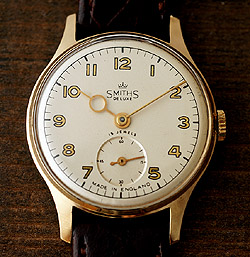 | 1950年代の短い期間にのみ生産していたサークルモチーフ付の時針を持つ極めて数の少ないデラックスモデルです。2ピースのケースはベゼル一体型の金メッキのケース、そしてSS製裏蓋とで構成されています。クリーム色の文字盤には黒ふちに金メッキを施した凝ったアラビア数字が配され、この時期のモデルの特徴といえます。また、このモデルの一番の魅力はなんと言っても、サークルモチーフ付の時針で、それがあるだけで、他とは全く違う雰囲気を作り上げています。コンディションはキズがほとんどない素晴らしい状態で、ムーブメントの美しさから、ほとんど使用されていなかった個体であると思われます。レンズ及びストラップは新品に交換されています。外径32mm。 |