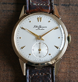 | ロンドンの老舗ジュエラーJ.W.Benson社がスミス社に製作を依頼したスペシャルクウォリティーの腕時計です。通常のスミス・デラックスに使用されている15石ハイクウォリティー・ムーブメントをチューニングした18石ムーブメントを搭載した、極めて高性能かつレアなモデルです。オリジナルのストラップ及びボックスが付属いたします。9金無垢ケースは太く、鋭いエッジが特徴のラグを持つ3ピース構造の個性的なもので、三角形のアワーマークがラグの形状と調和した、とても美しいデザインといえます。ムーブメントにはJ.W.Bensonの刻印が刻まれ、見た目にも魅力的です。コンディションは、使用回数が少なかったと思われ本体には、ほとんどキズやエイジングが見られず素晴らしい状態を保っています。また、オリジナルのストラップとボックスには多少のエイジングが見られるものの良いコンディションをを保っています。ボックス内部の文字は、もともと金箔であったと思われますが、緑青により緑色に変色しています。これは、エイジングしたディテールと調和したヴィンテージ・アイテムならではの味わいといえるでしょう。