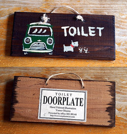 | イラストレーター Yasuo Okuma のデザインのドア・プレートです。天然の杉材にひとつひとつアクリル絵具で描いて仕上げてあります。使用されているアクリル絵の具は、カレンダーなどのイラストを描く際に使われている絵具と同じものです。つまり、サイズは小さいながらも、一枚の原画として味わっていただける贅沢なアイテムなのです!