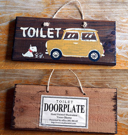 | イラストレーター Yasuo Okuma のデザインのドア・プレートです。天然の杉材にひとつひとつアクリル絵具で描いて仕上げてあります。使用されているアクリル絵の具は、カレンダーなどのイラストを描く際に使われている絵具と同じものです。つまり、サイズは小さいながらも、一枚の原画として味わっていただける贅沢なアイテムなのです!