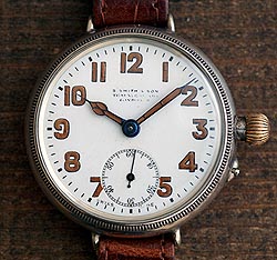 | 1914年に生産されたスミス社製のトレンチ・ウォッチです。婦人用のアクセサリーとしてはブレスレット型の時計が1890年代頃から極少数造られていましたが、紳士用の腕時計としては世界的に見ても1910年前後から造られ始めたと言われています。そのためムーブメントは婦人用の懐中時計がベースとなっており竜頭の形状も懐中時計の物と同じデザインです。また、竜頭の脇にはピンが付いており、時刻を設定する際にはこのピンを爪で押し込みながら竜頭を回す方式で、これも当時の懐中時計に準じます。文字盤はセラミック製で文字はすべて手描きによるものです。銀無垢ケースはボーゲル・ケースと呼ばれているもので、裏蓋が無くベゼルを回転させてレンズ、ベゼル、文字盤、ムーブメントがそっくり取り外せるユニークな構造です。ベゼルを回転させる際には竜頭を引っ張りだした状態で行うため、多少のコツがいる作業となります。戦前の製品はクルマなどと同様に扱いに慣れが必要な部分が多く、現在では、それらが趣味性の高さとして捉えられています。ムーブメントはスイスのロンジン社の15石が搭載されているためクウォリティーに関しても申し分ありません。外径35mm。