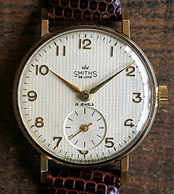 | 1953年に製造された9金無垢デニソン社製ケースに極めて珍しいキャラメル・パターンのスモールセコンド・ダイアルが搭載された15石のデラックスです。デラックスは1215の後継モデルで、1215ムーブメントの幾つかの問題点を克服してさらに洗練されたムーブメントであるCタイプ・キャリバーを搭載しデラックス・モデルの名に恥じないクウォリティーを手に入れました。このデラックスは9金無垢のデニソン社製3ピース・ケースを纏っているだけに、当時のデラックスの中でもハイグレード・モデルといえます。また、このモデルで特筆すべきことは文字盤のデザインです。生産数の極めて少ない、そして、独特の雰囲気を持った美しいキャラメル・パターン・ダイアルはコレクターの間で珍重されています。デニソン社製の9金無垢ケースは繊細な印象を与える作り込みとエッジの効いたシャープなデザインが魅力です。定評のある15石スモールセコンド用ムーブメントは精度が高いばかりではなく、整備性の良さやデザインの美しさも見逃せません。裏蓋に掘り込まれたイングレイビングもこのモデルの魅力をより一層引き立てている要素といえるでしょう。外径31.2mm。