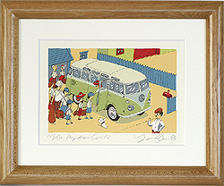 イラストレーターYasuo OkumaのシルクスクリーンMy dear CarシリーズのNo.13です。毎年増え続ける家族。はたして今年の旅行で全員乗れるのでしょうか?■インチサイズ木製フレーム付。■フレームサイズ: 285×237mm■限定数:200枚(サイン、エディションナンバー入り) ■シルクスクリーンとは?シルク(現在ではテトロンなどの化学繊維を使用した版により刷り重ねてゆく版画です。フラットで厚みのある色面は発色に優れ、また耐光性が極めて良く一般の印刷と違い変色がほとんどありません。