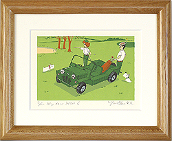 | イラストレーターYasuo OkumaのシルクスクリーンMy dear MiniシリーズのNo.6です。ゴルフで彼女にカッコ良いとこを見せるつもりが、ボールはバンカーに・・・。