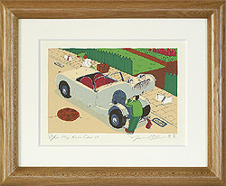 | イラストレーターYasuo OkumaのシルクスクリーンMy dear CarシリーズのNo.10です。今日はカニ目で初ドライブへ。荷物を運んできた彼女。トランクはどこかしら・・・?■インチサイズ木製フレーム付。■フレームサイズ: 285×237mm■限定数:200枚(サイン、エディションナンバー入り)