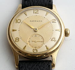 | 1962年英国スミス・ガラード9金無垢18石腕時計90日間保証付 1735年宝石店としてロンドンに創業した老舗、ガラードのためにスミスが製作した超ハイクウォリティー18石ムーブメント搭載のモデルです。18石はスミス製15石スモール・セコンド付をチューニングして製作したスペシャル・ムーブメントです。スミスの中で最も優れたメカニズムとされています。このムーブメントを搭載したスミスは数が少なくとてもレアですが、こちらはさらに数が少ないガラードモデルです。文字盤には経年変化が見られますがムーブメントを含め金無垢ケースなどニア・ミントといえます。 |