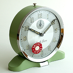 | 1950年代スミスアラーム目覚まし時計(ニューダウン・グリーン)デッドストック新品箱保証書付(初期動作保証付)通常価格\157,500 英国の時計店に50年以上もの間スミス社の段ボール箱に入ったまま新品状態で眠っていたデッドストック品です。すべてにおいて完璧な状態ですが、製造時についたと思われるかすかな擦れや塗装のムラなどがあり、1950年代の製品におけるクウォリティーとご理解ください。ゼンマイは時計の動力用とアラーム用のふたつが搭載され、ゼンマイの動力がある限りボディー上部のボタンを押すまでアラームがなり続ける方式です。オリジナルボックス及び保証書などもまさに新品状態です!★ご注意:デッドストックであることと、完璧な動作を示すことで、こちらの製品はオーバーホールをさせていただいておりません。そのため保証は、お手元に届いた時までの初期動作保証のみとなります。実用に使われるなどで、事前にオーバーホールをご希望の場合は¥18,900にて行わせていただき、365日間の動作保証を付けさせていただきます。★新品未使用品ですが、オリジナルボックスも含め多少の経年変化(ホチキスの錆びや印刷の色褪せ、金属部分の変質などがある場合がございますが、ご了承ください。 ダイキャスト製のしっかりした土台がついたスミスアラームのスタンダードモデル。パステルグリーンのボディーはまさに1950年代のデザインといえます。外径約113mm |