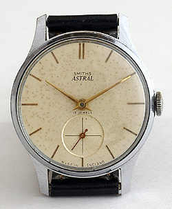 | 1950年代英国スミス社製アストラル15石SSケース手巻腕時計365日間保証付 SSケース製のレアなアストラルです。文字盤には経年変化によるドットが満遍なく発生していますが、文字盤のほぼ全域に均一に現れているため不自然さはなくアンティークらしさを感じさせるアイテムといえます。ケースは左上のラグから円周にかけてキズがありますが全体的には極めて良いコンディションです。また、ムーブメントはオーバーホールを済ませたばかりで完璧な状態です。文字盤にアンティークらしさを感じられる方にはとてもお買い得な価格です。新品本皮ストラップ付。外径約32.5mm |