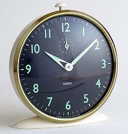 | 1960年代スミス社製目覚まし時計(レベリ)デッドストック新品箱保証書付(初期動作保証付)ブラック・ダイアルとルミナス(夜光塗料)が個性的な目覚まし時計です。英国の時計店に40年以上もの間スミス社の段ボール箱に入ったまま新品状態で眠っていたデッドストック品です。すべてにおいて完璧な状態ですが、製造時についたと思われるかすかな擦れや塗装のムラなどがあり、1960年代の製品におけるクウォリティーとご理解ください。ゼンマイは時計の動力用とアラーム用のふたつが搭載され、ゼンマイの動力がある限りボディー上部のボタンを押すまでアラームがなり続ける方式です。オリジナルボックス及び保証書などもまさに新品状態です!★ご注意:デッドストックであることと、完璧な動作を示すことで、こちらの製品はオーバーホールをさせていただいておりません。そのため保証は、お手元に届いた時までの初期動作保証のみとなります。実用に使われるなどで、事前にオーバーホールをご希望の場合は¥18,900にて行わせていただき、365日間の動作保証を付けさせていただきます。★新品未使用品ですが、オリジナルボックスも含め多少の経年変化(ホチキスの錆びや印刷の色褪せ、金属部分の変質などがある場合がございますが、ご了承ください。 プレス製の土台がついたスミスアラームのスタンダードモデル。外径約115mm |
