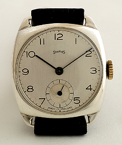 | 1946年英国スミス社製シルバー15石手巻腕時計365日間保証付 銀無垢クッションケースの超レアモデルです。戦後、ジャガールクルトの技術が導入されて初めて作られたCタイプムーブメントの元になったものです。その後、Aタイプ、Bタイプを経てもっとも一般的なCタイプへと変化してゆきます。この英国デニソン社製クッションケースは、ほとんどが裏面にインペリアル・ケミカル・インダストリーの刻印のあるプレゼンテーションウォッチですが、このアイテムは、それがなく特に貴重であるといえます。また、ケース、文字盤、ムーブメントのどこをとっても素晴らしい状態で、ほとんど使われていなかったことを物語っています。ムーブメントは初期モデルの特徴でもあるニッケルメッキを施したとても美しいデザインが魅力的です。新品本革ストラップ付。竜頭を含まない幅約30mm |