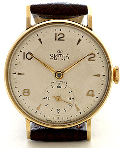 | 1948英国スミス社製デラックス9金無垢15石手巻腕時計365日間保証付 1948年のレア・ダイアルモデルです。1948年にはデラックスモデルはリリースされていない可能性が高く、1950年代に入ってから1948年製造のケースに組み込んで販売されたモデルであると思われます。スミス社はこのようにケースと文字盤の年式がずれている製品をたびたびリリースしていたことが知られています。全体的なコンディションは極めて良いのですが、ケースのラグ部分にはレストアを施した部分があり、また、ムーブメントはポリッシュされていてオリジナルのカラーとは若干異なります。また、文字盤には微細な経年変が見られます。新品本革ストラップ付。外径約31mm 通常価格\294,000 |