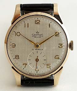 1954年英国スミス社製デラックス9金無垢手巻腕時計365日間保証付 タイルが敷きつめられたような珍しい文字盤を持つデラックスモデルです。ピンクゴールド製のケースは小さなキズがいくつかあるものの使用頻度少ないとても良いコンディションです。また、文字盤は、周囲にかすかな汚れが見られる以外はミントコンディションと言えるでしょう。ムーブメントはよく整備されたミントコンディションです。外径約31.5mm