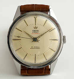 | 1960年代スミス社製腕時計の中では極めて生産数の少ないオートマティック仕様のエヴェレストです。ケースはステンレス・スチール製の35mmマグナムサイズでずっしりと重たい風格あるアイテムです。使い込まれているため、各部にはキズなど多く見られますがヘコミやクラックなどは全くない良いコンディションを保っています。文字盤も年式にふさわしくエイジングしており、不自然な箇所はありません。レンズとストラップは新品が装着されていますが、他は、すべて、オリジナルコンディションといえるでしょう。メカニカル面では、多少ローターのベアリングに音がでていますが、良く整備されています。スミス社の最高級アイテムとして位置づけられていたインペリアルとエヴェレスト・オートマチックの中で、地味な存在ではありますが、センスの光るSSモデルはスミスを知り尽くしたコレクターにはベストチョイスといえるのではないでしょうか。外径約35mm