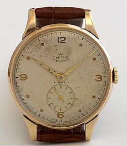 | オースティン社が50周年記念の年に退職する社員へ贈ったプレゼンテーション・ウォッチです。当時二種類のスミス・デラックスが使用されていましたが、こちらはローズゴールド、35ミリマグナムサイズ・ケース仕様の最高級モデルで管理職など位の高い社員へ贈られていたモデルであったと考えられています。コンディションは、ケース裏側のラグ付近に少々深いキズ、そして文字盤のエイジングなどから、かなり使い込まれていたアイテムであると思われます。ただし、ムーブメントは極めて良く整備されており、とても良い状態を保っています。ケース裏側にはオースティン社の刻印が入り、オリジナルボックスには、紋章および文字が金箔押しされています。スミスのコレクターはもちろん、オースティン・ファンにも極めて貴重なアイテムであるといえるでしょう。 |