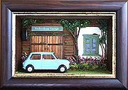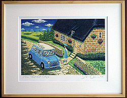 イラストレーターYasuo Okumaのシルクスクリーン(版画)イングリッシュコテージシリーズ。田舎の民家と英国車をモチーフにした絵柄です。新築のギフトなどにも最適です。