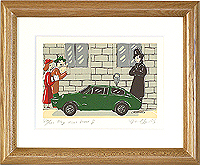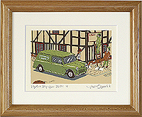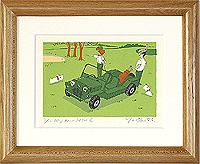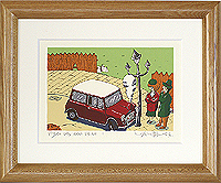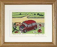 シルクスクリーン My dear Mini No.2 イラストレーターYasuo OkumaのシルクスクリーンMy dear MiniシリーズのNo.2です。ドライブ中にエンジントラブル?でも、イギリスの春は陽か長いので、ゆっくり修理できます!?
