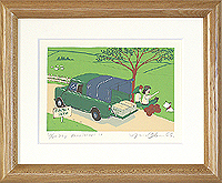 シルクスクリーン My dear Mini No.11 イラストレーターYasuo OkumaのシルクスクリーンMy dear MiniシリーズのNo.11です。整備に余念のない彼にお茶を運ぶ彼女。ミニのルーフがテーブルがわりに?