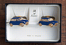 1960〜70年代の製品と思われるSTRATTON社製のミニがデザインされたカフスボタンです。本体は使用感のない新品同様の状態ですが、オリジナルボックスには写真でお分かりいただけるように幾つかのクラックがあります。現代のこのような製品の多くは、ブランドが英国であっても実際に製造しているのは中国などのアジアの工場ということがほとんどですが、生産も英国で行われていた当時の製品は今後、価値が上がって行くアイテムといって良いでしょう。ミニの全長24mm。