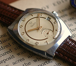 1960年製造の9金無垢ケース、ベンソンの腕時計です。ケースはロンドンのBWC製の9金無垢で、個性的なファンシー・ラグが魅力です。文字盤はアイボリーのベースに立体的なアラビア数字とアワーマークのシンプルなデザインです。また、ムーブメントはスイス製の15石ハイクウォリティー・キャリバーが搭載されています。外径:31.8mm。
