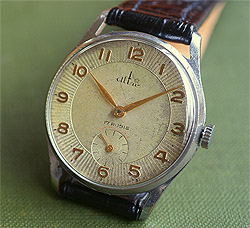 1950年代にリリースされたスイスTENAX社製のプレシジョン・モデルです。極めてレアなスイスのメーカーで、現存している個体は少ないようです。とてもチャーミングな金メッキ・ケースと厚みのあるレンズがアールデコ調の雰囲気を作り出しており、繊細な文字盤と伴い、まるで宝石のような時計です。ムーブメントには極めて精度の高い15石キャリバーが搭載されています。ケース幅18.4mm(竜頭を含みません)。