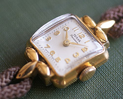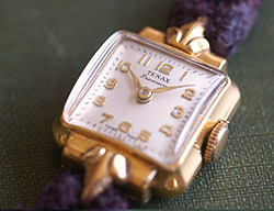 1950年代にリリースされたスイスTENAX社製のプレシジョン・モデルです。極めてレアなスイスのメーカーで、現存している個体は少ないようです。とてもチャーミングな金メッキ・ケースと厚みのあるレンズがアールデコ調の雰囲気を作り出しており、繊細な文字盤と伴い、まるで宝石のような時計です。ムーブメントには極めて精度の高い17石キャリバーが搭載されています。ケース幅18.4mm(竜頭を含みません)。