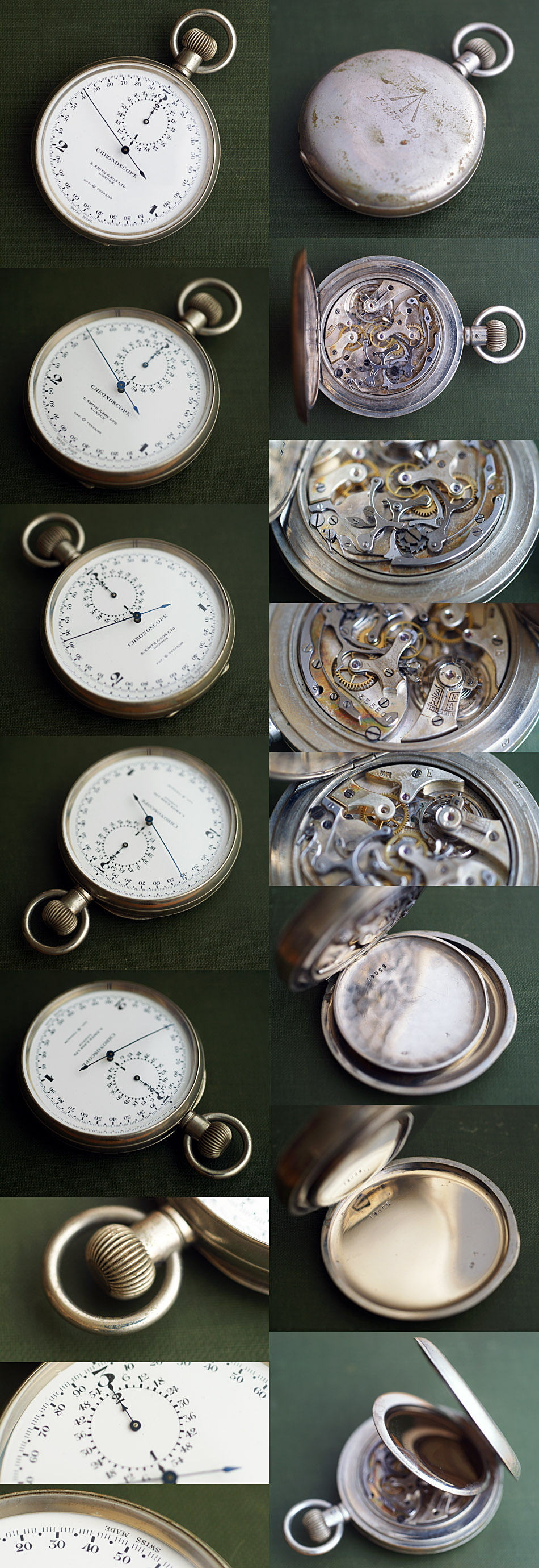 | 1920年代に生産された軍用1/100秒計測ストップウォッチです。外径58.3mmと大き目なニッケル無垢ケースは軍用にデザインされた製品です。クロノスコープという名称のこの製品は、一周3秒の高速で回る極めて精度の高いメカニズムが搭載されています。外径58.3mm。 |